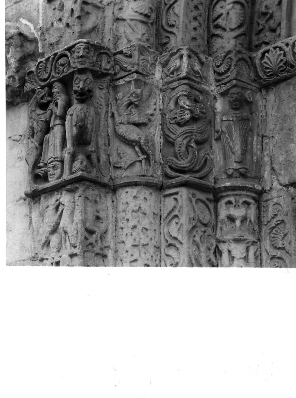 Decorazione plastica a rilievo della serie di capitelli. Raffigurazioni mostruose, affiancate da un soggetto religioso di chiaro valore simbolico: il vescovo dell'ultimo capitello destro del portale, custodi entrambi della chiesa e garanti della salvezza di chi vi entra