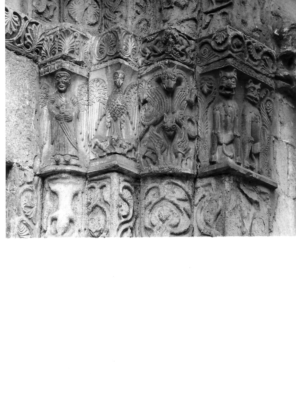 Decorazione plastica a rilievo della serie di capitelli. Raffigurazioni mostruose, affiancate da un soggetto religioso di chiaro valore simbolico: il vescovo dell'ultimo capitello destro del portale, custodi entrambi della chiesa e garanti della salvezza di chi vi entra