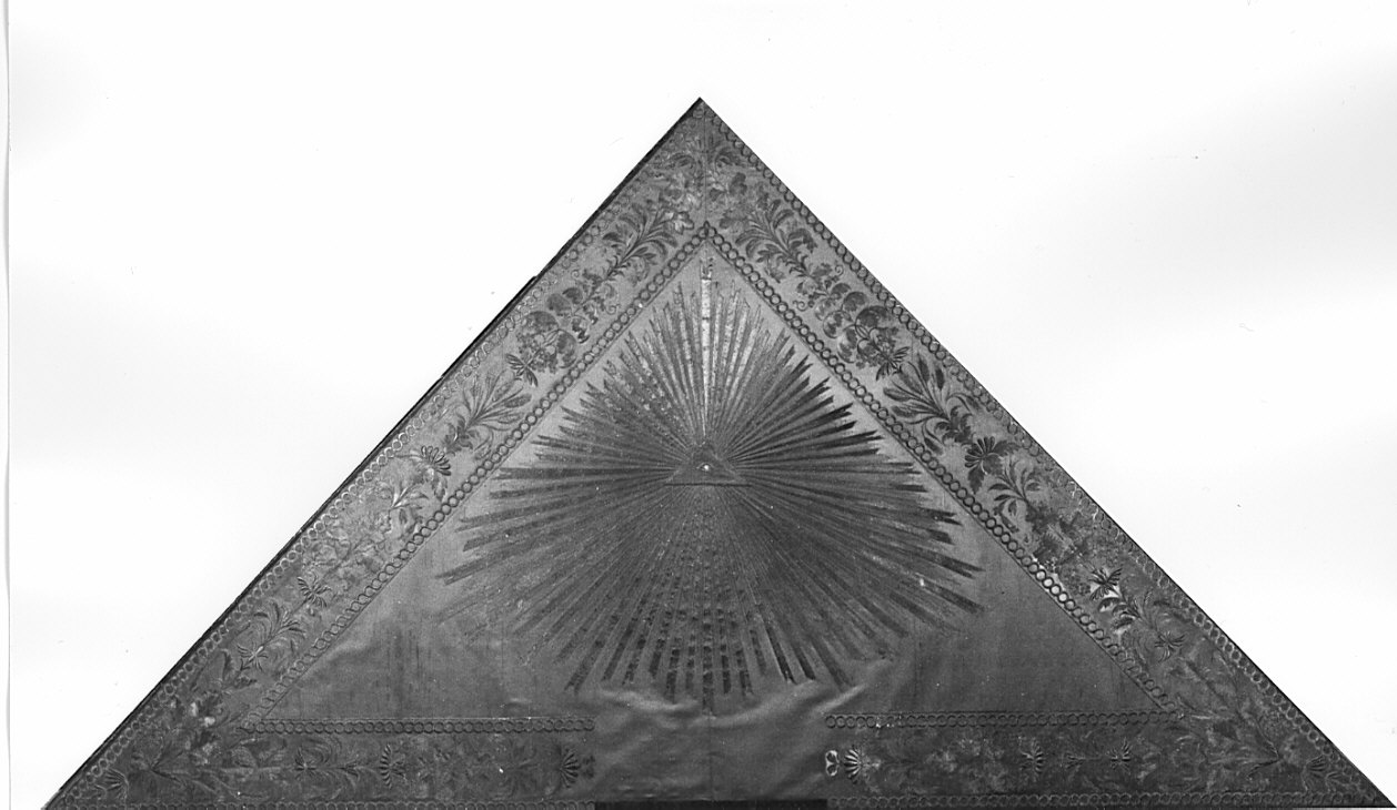 Traccia recante lungo il perimetro una fascia delimitata da una doppia cornice a tondi e contenente motivi decorativi vegetali stilizzati. Al centro, entro un triangolo da cui partono raggi; è ricamato l'occhio divino