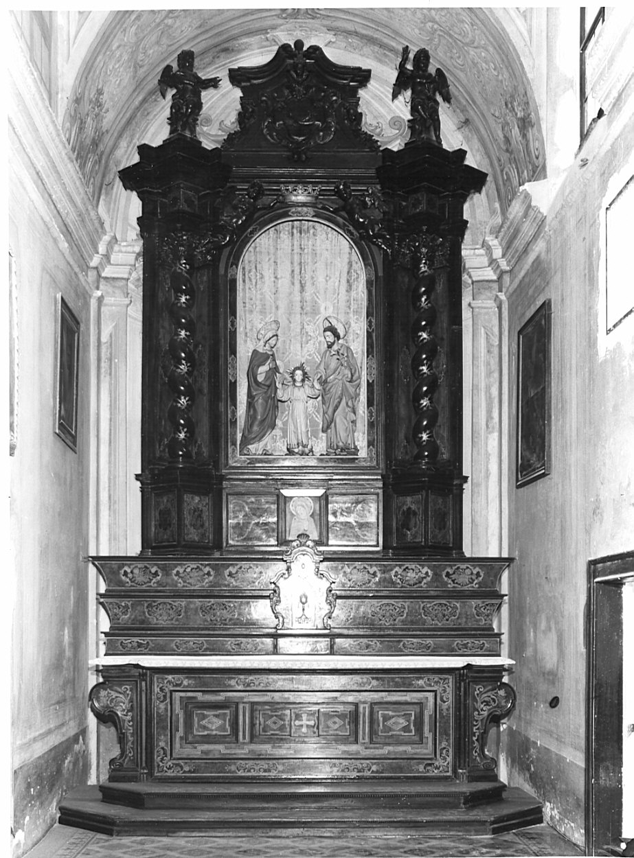 Altare con largo paliotto a tre gradini intarsiati; soasa di due colonne tortili nere poggianti su due piedistalli a sezione quadrata posti in diagonale; cimasa a due angeli a bassorilievo intorno all'arcata della nicchia; grane cartella ornata e intagliata e due angeli laterali in piedi a tutto tondo