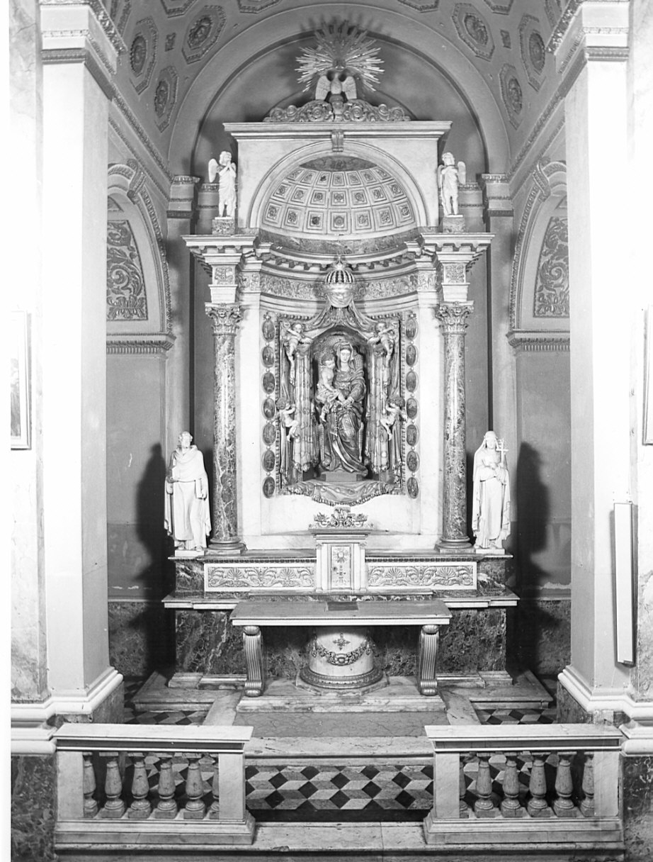 Altare costituito da mensa e ancona a nicchia, con statue e medaglioni