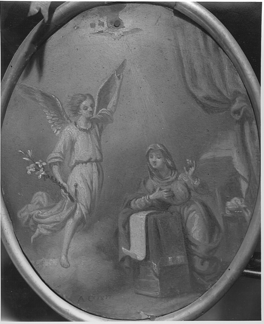 Personaggi: Madonna; San Gabriele Arcangelo. Simboli: (Spirito Santo) colomba. Mobilia: inginocchiatoio. Oggetti: tenda. Fiori: giglio