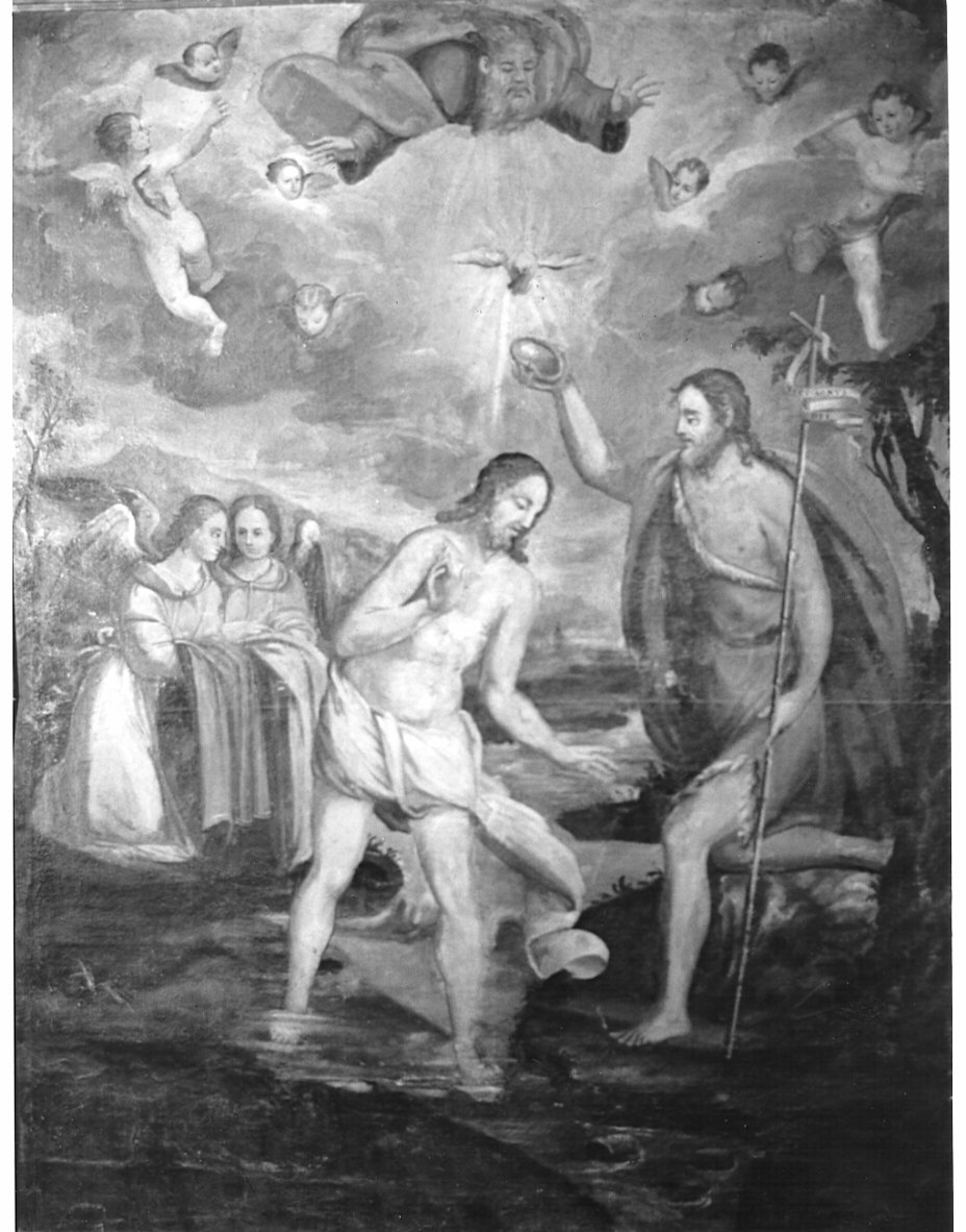 Personaggi: Cristo; San Giovanni Battista; Dio Padre. Simboli: (Spirito Santo) colomba. Attributi: (San Giovanni Battista) bastone crociata; cartiglio. Figure: angeli; cherubini; angioletti. Fiumi: Giordano