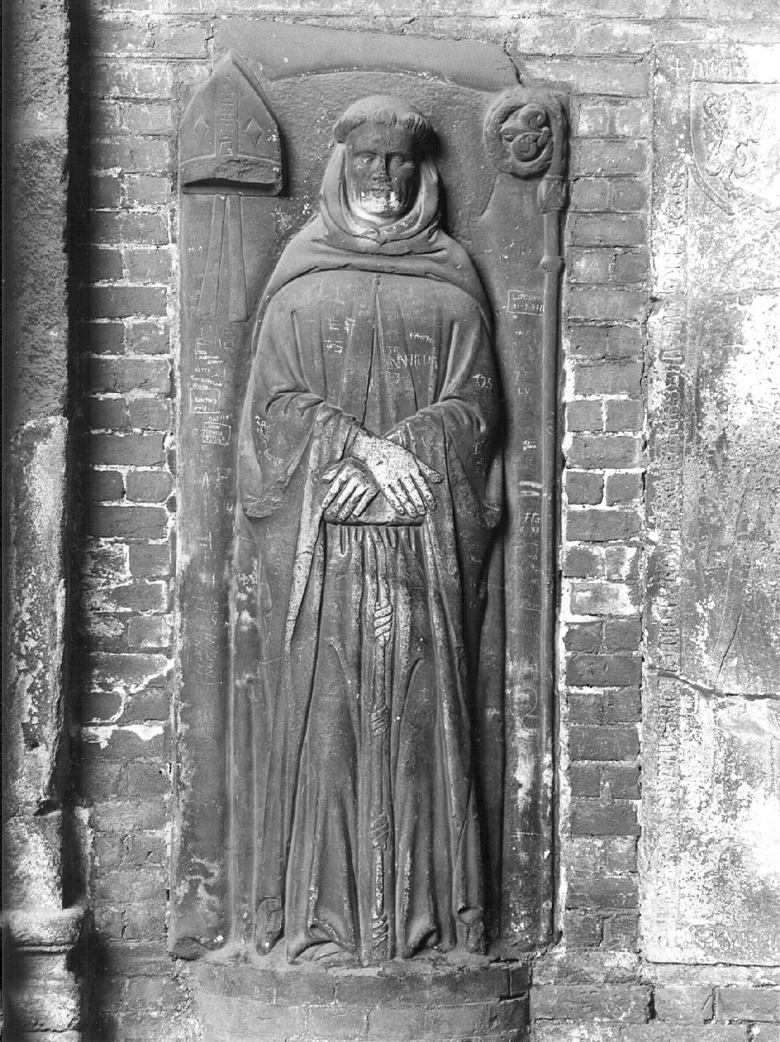 Lastra di marmo bianco scolpito a bassorilievo. E' raffigurato un monaco francescano a figura intera, di prospetto in età matura, col viso sereno sbarbato ed i capelli a corona intorno al capo calvo, le mani incrociate sul petto. Avvolto da ampio saio con oordone in vita e un mantello aperto davanti e col cappuccio. A lato del capo le insegne vescovili mitra e pastorale