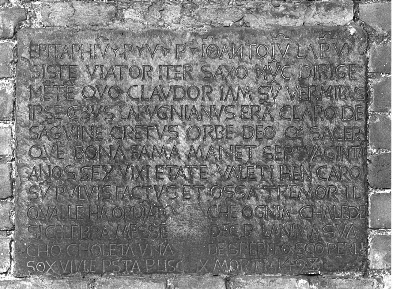 - ISCRIZIONI EPITAPHIU P V P IO ANTOIU LAPU/ SISTE VIATORITER SAXO NUC DIRIGE/ METE QUO CLAUDOR IAM SU VERMIBUS / IPSE GBUS LAPUGNANUS ERA CLARO DE/ SAGUINE CRETUS ORBE DEO Q SACER/ QUE BONA FAMA MANET SEPTUAGINTA/ ANOS SEX VIXI ETATE VALETI HEN CARO/ SU PULVIS FACTUS ET OSSA TREMOR IL/ QUALLE HA ORDIATO CHE OGNIA CHALEDE/ SI CELEBRA MESSE DEC P LANIMA SUA/ CHO CHOLETA UNA DESPERITO SCOPERLI/ SOX VIVIE PSTA P LI SOX MORTI 1497 - lettere capitali -