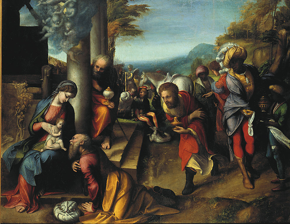 - NOTIZIE STORICO CRITICHE L'iconografia risulta consueta, anche se il Bambino non è stato rappresentato appena anto, ma nell'atto di benedire e di porgere il piedino da baciare ad uno dei re prostrato e in ginocchio. Il Berenson, nel 1901, precisava che l'attribuzione al Correggio era stata da lui proposta per la prima volta, anche se secondo il Carotti (1897) sarebbe stato G. Bertini, direttore della Pinacoteca di Brera, a riconoscere nel Correggio l'autore di quest'opera che portava l'antica attribuzione a Ludovico Mazzolino.Dal Berenson in poi la critica non ha più mostrato esitazioni sulla paternità di questo dipinto giovanile dell'Allegri. Per quanto riguarda la datazione, inizialmente si riteneva quest'opera molto vicina alla Natività presente nella Pinacoteca, e dunque collocabile tra il 1513-1514. R. Longhi (1958) per primo ha sottolineato la distanza di questo dipinto dallo stile ancora mantegnesco e costesco del Correggio della Natività per collegarlo piuttosto al protomanierismo emiliano e la Beccafumi.A. O. Quintavalle (1970) notava che nel dipinto l'autore ha utilizzato due punti di vista prospettici: uno per la parte sinistra con la Sacra Famiglia e l'architettura, un altro per il gruppo di destra. Collocava l'opera intorno al 1518, cronologia sostenuta anche dai successivi critici, che propendono per una esecuzione tra il 1516 e il 1518.I numerosi spunti tratti da artisti coevi (oltre a cquelli citati, anche Leonardo, Raffaello e Giorgione), rendono quest'opera un po' teatrale ed eleborata, ritenendo, la Nicoletta Roio, che la si possa datare non oltre il 1516-1517. Da notare la fastosità cromatica e il particolare dei tre Magi, solitamente raffigurazione dell'età dell'uomo