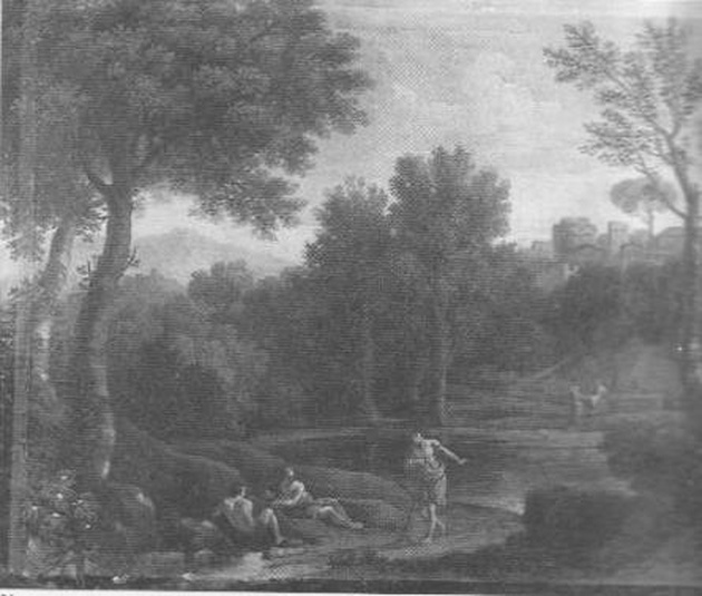 Paesaggio con figure in riva al fiume. paesaggio fluviale con figure e architetture