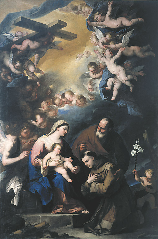 - NOTIZIE STORICO CRITICHE Il dipinto fu eseguito per la chiesa dello Spirito Santo a Venezia. Datato da W. Arslan al 1660 e dal Bologna al 1652-1654 (al tempo di un presumibile viaggio di Luca Giordano a Venezia), l'opera è databile al 1664- 1665, anni in cui è accertata con sicurezza l'assenza di Luca Giordano da Napoli ed è riportato un suo viaggio a Firenze e in altre parti d'Italia, fino a Venezia (F.S. Baldinucci). E' evidente infatti il richiamo alla maniera riberesca che si manifesta, in questo dipinto come nelle altre pale d'altare veneziane, già fuso in un pittoricismo barocco che aveva risentito degli esempi di Mattia Preti, di Pieter Paul Rubens e di Pietro da Cortona. Il tema fondamentale dell'opera è l'apparizione della Croce alla Sacra Famiglia, venerata da Sant'Antonio da Padova.: questo tema, mai accettato esplicitamente dalle autorità ecclesiastiche, ebbe un singolare carattere 'neomistico' connesso alla devozione francescana prima e poi di quella carmelitana; un tema alquanto diffuso in Italia e che ebbe speciale fortuna a Napoli proprio verso la fine del sesto decennio del secolo, con l'insediamento dei monasteri dell'ordine teresiano e alcantariano. Lo stesso Giordano aveva trattato tale tema nella pala d'altare della chiesa di San Giuseppe e Teresa a Pontecorvo a Napoli, datata 1660 e quasi immediatamente replicata in un dipinto attualmente al Musée des Beaux- Arts di Saint Etienne (ora in deposito al Louvre). Ad una vendita Finarte a Milano del 17 dicembre 1987 (n. 629 del catalogo) fu presentata una versione di questo dipinto (olio su tela, cm. 100 x 67,5) che ha carattere di riedizione autografa anzichè di modelletto preparatorio