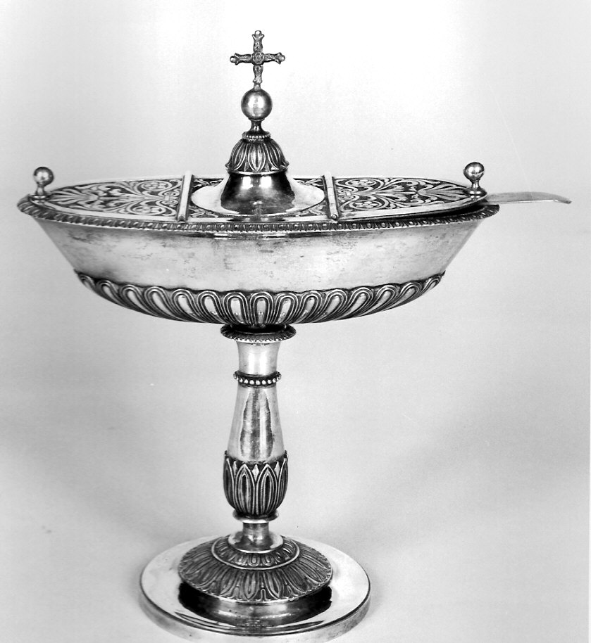 Navicella con cucchiaino. Piede su basamento circolare liscio, definito da fasce che includono rispettivamente piccoli ovuli entro semicerchi e larghe foglie stilizzate riprese nella parte inferiore del fusto. Il corpo baccellato con cornice sporgente ha il coperchio composto da due parti mobili incernierate, comprese tra una parte centrale fissa dove poggia una calotta con cupolino sormontato da crocetta su globo. Le valve con levette a forma di pomo sono decorate da motivi fitomorfi impaginati secondo una disposizione geometrica. Il cucchiaino di forma allungata è privo di decorazione