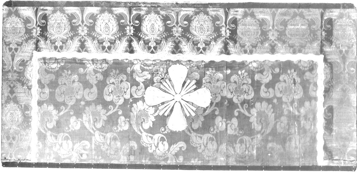 - NOTIZIE STORICO CRITICHE Il disegno a fiori di melograno e pigne fiorite entro incorniciatura romboidale di 4 foglie a piumetta è tipico dei primi anni del Settecento, ma le forme rigide e schematiche del fiore e delle foglie che richiamano formule di stile Impero e la broccatura in oro senza variazioni di filato, fanno pensare ad una manifattura Secondo Impero ed inducono a datare il tessuto nel 2° quarto dell'Ottocento.Nel damasco della parte centrale, invece, il disegno di fiori e foglie è assai vicino ai modelli del primo Settecento, anche se la disposizione lungo tralci che si snodano in verticale a zig-zag lo data già nel 2° quarto del secolo. L'appliqué della croce, dai materiali e moduli formali tipici del gusto tardo neo-classico (cannettato laminato, motivo a balaustro, a palmetta, le 2 foglie d'acanto stilizzate in profilo, le volutelle che terminano in un fiore pare coevo del tessuto delle bordure. Il paliotto fu probabilmente confezionato nel tardo Ottocento usufruendo di vari frammenti (otto) di antico tessuto cuciti insieme, ed a questo periodo è databile il gallone
