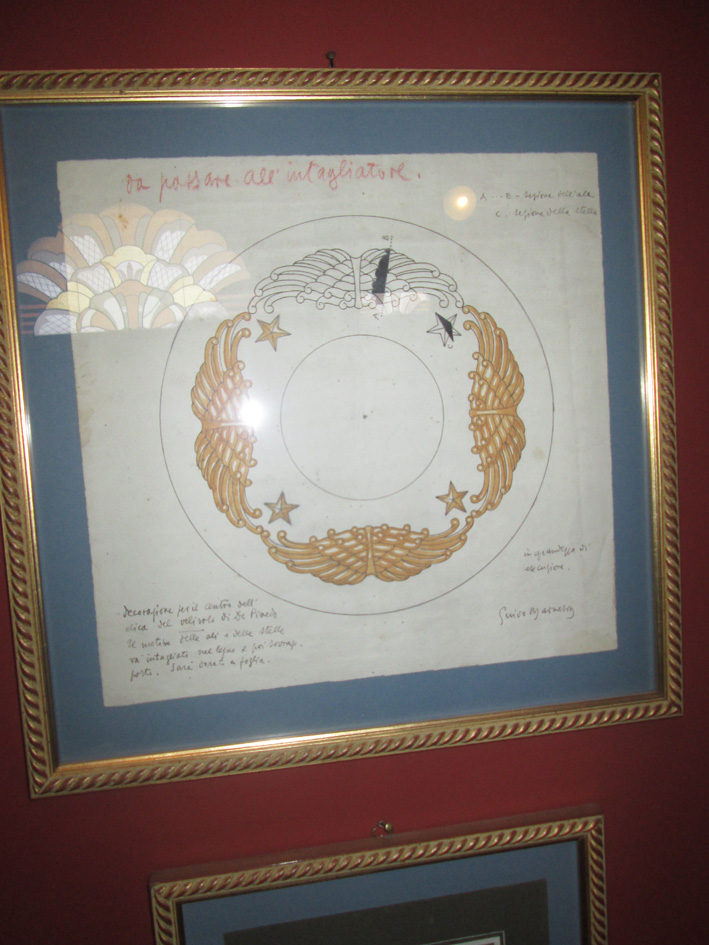 - ISCRIZIONI in basso a sinistra - Decorazione per il centro del'/elica del velivolo di De Pinedo/ Il motivo delle ali e delle stelle/ va intagliato nel legno e poi sovrap-/ posto. Sarà dorato a foglia - corsivo -