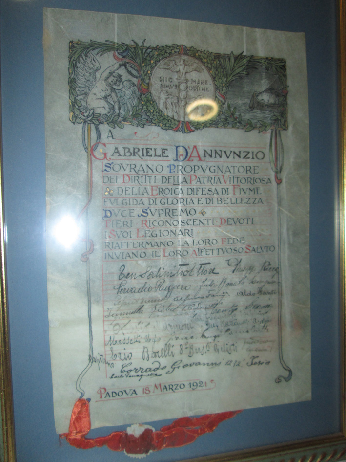 - ISCRIZIONI al centro - A/ GABRIELE D'ANNUNZIO/ SOVRANO PROPUGNATORE/ DEI DIRITTI DELLA PATRIA VITTORIOSA/ DELLA EROICA DIFESA DI FIUME/ FULGIDA DI GLORIA E DI BELLEZZA/ DUCE SUPREMO/ FIERI RICONOSCENTI E DEVOTI/ I SUOI LEGIONARI/ RIAFFERMANO LA LORO FEDE/ INVIANO IL LORO AFFETTUOSO SALUTO/ PADOVA 18 MARZO 1921 - capitale -