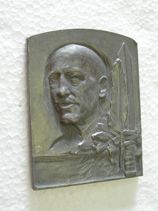 Medaglia in piombo. Recto:busto di d'Annunzio volto leggermente verso sinistra. Sulla destra, in verticale, pugnale e penna d'oca allacciati con un nastro a rametti d'alloro e quercia. Verso: iscrizione. Bordo liscio, lato superiore arcuato