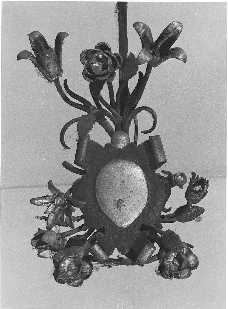 Stelo per le lampade in ferro battuto con stemma gentilizio senza alcun disegno incorniciato da fiori di rose selvatica, gigli e margherite