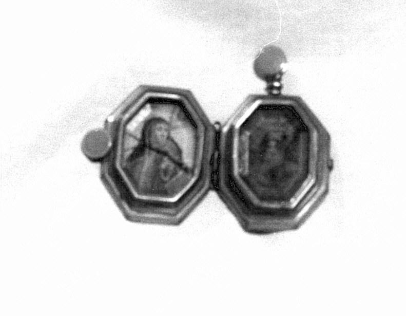 Custodia in ottone, a due valve chiudibili di forma ottogonale. Ciascuna valva ha da un lato le reliquie, dall'altro due piccole miniature, rappresentanti S. Chiara, in abito francescano e l'addolorata, in rosso e azzurro