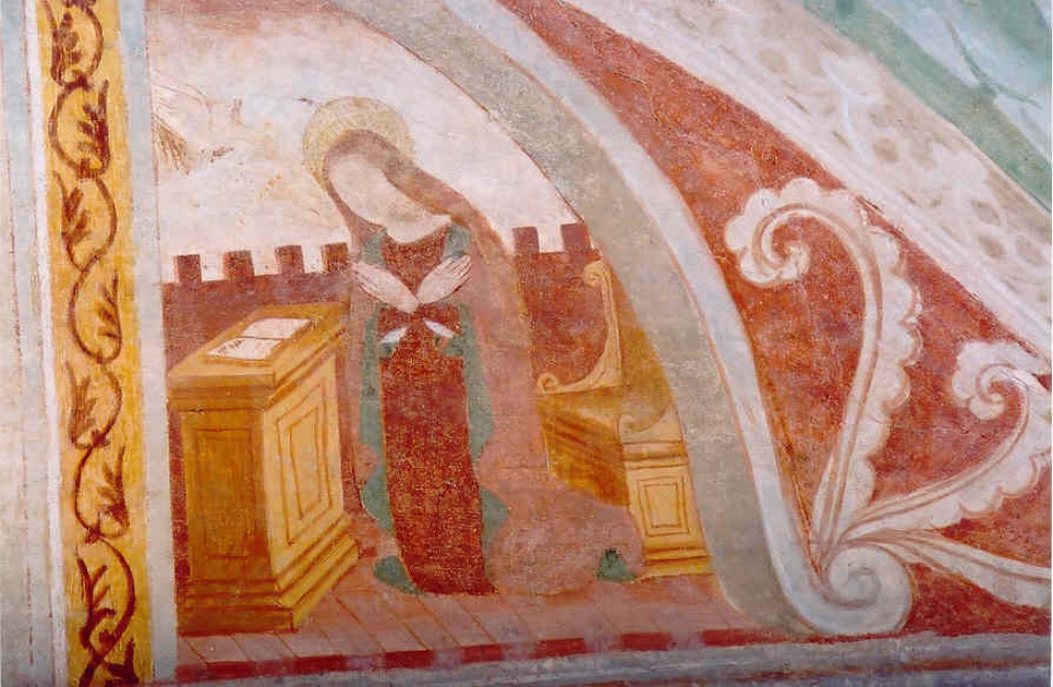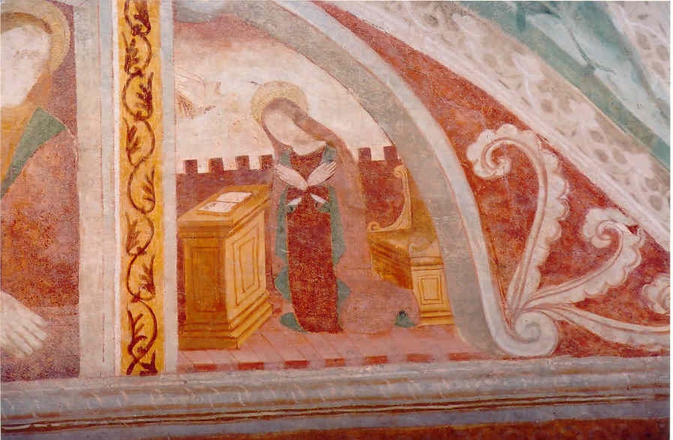 Personaggi: vergine MariaAbbigliamento: tunica; mantelloArchitetture: torre merlata; pavimento a dogheOggetti: inginocchiatoio; panca