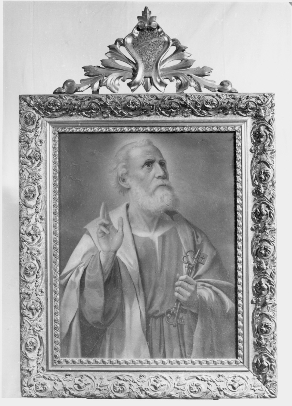 Cornici rettangolari in stucco dorato a stampo applicato si legno, che presentano un profilo interno a fogliette e una fascia esterna più larga a girali continui arricchiti da rosette e foglie.La cornice è sormontata a un fastigio in legno intagliato e dorato, differente nei tre pezzi. Due presentano un motivo di foglia allungata, con superficie interna zigrinata attraversata da una banda liscia in diagonale, sormontata da una palmetta. La terza porta foglie trilobate con al centro una palmetta. Le cornici, differenti per misure, contengono delle oleografie raffiguranti San Pietro, San Paolo e San Giuseppe, i nessun valore