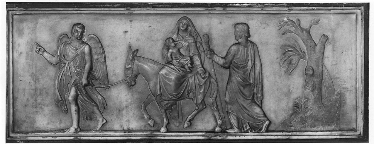 Scultura a bassorilievo. La formella rettangolare raffigura l'episodio della Fuga in Egitto: un angelo guida il somarello su cui siede Maria con il Bambino, mentre San Giuseppe li segue. Sullo sfondo a destra due alberi quintano la scena