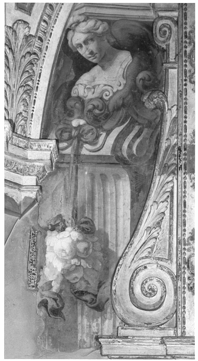 Nello spazio tra gli stucchi dei pennacchi della volta e della cornice dell'affresco raffigurante due due catriatidi, in grigio e avorio, poggianti sul basamento scanalato grigio da cui pendono frutti (mele cotogne ?) in tinte chiare