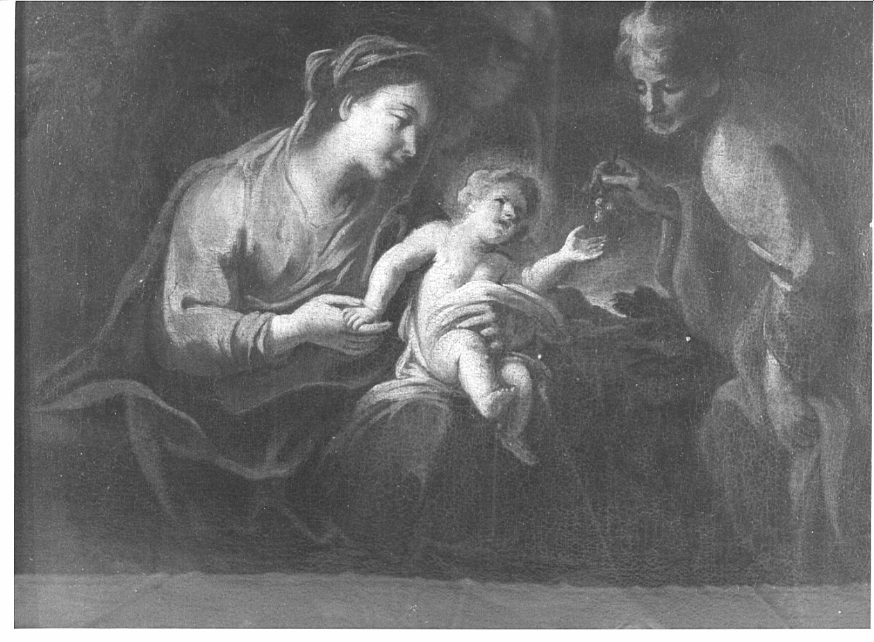 - NOTIZIE STORICO CRITICHE acquistato dall'antiquario v.Bellini, il piccolo dipinto è presentato dal parroco don Giulio Gabanelli con l'attribuzione a nicola grassi. in effetti la grazia delle figure, il tocco rapido e sicuro, la pastosità della pennellata rivelano la mano disinvolta e briosa di nicola grassi, pittore di nascita e prima formazione friulana ( presso il carnèo) e quindi veneziana (piazzetta, pittoni, sebastiano Ricci), con movenze e grazie bozzettistiche di gusto rococò. i volti dei personaggi sono tipici di nicola grassi e l'atteggiamento del bambino si ritrova in altre opere del pittore (v. cat. mostra di n.grassi a udine, 1961 a cura di G. gallo e A. rizzi; pallucchini, in 'pittura veneziana del Settecento"; articolo di u. ruggeri in "arte veneta" 1982, P.301). del pittore sono presenti varie opere nel bergamasco (parrocchiaie di trescoere balneario, di chiuduno, di endenna con una "pietà" del 1731 . cfr. pagnoni,"chiese parrocchiali bergamasche:1 1979). anche questa opera è attribuibile al iii-iv decennio del Settecento