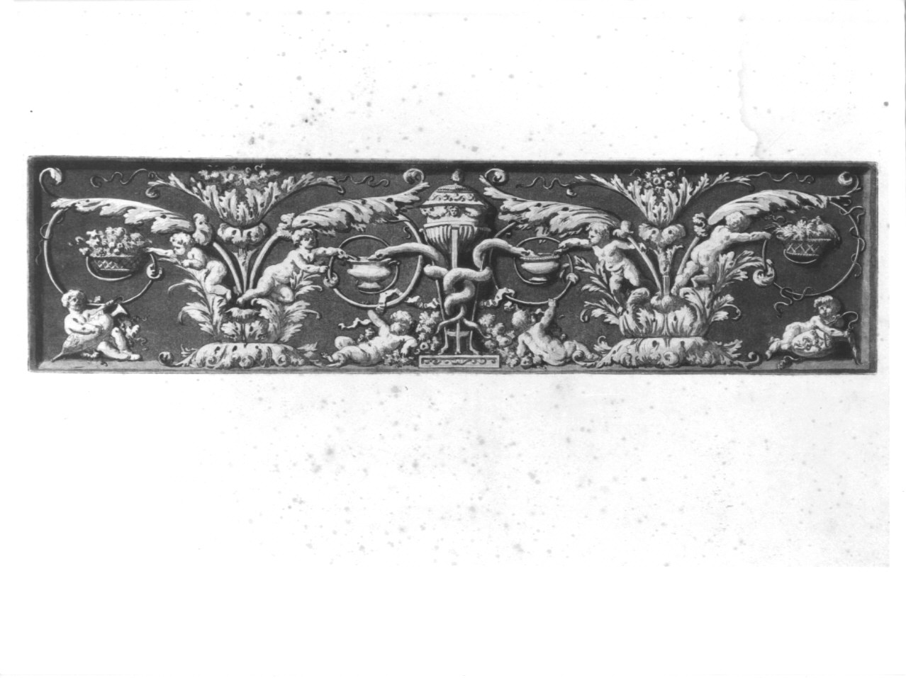 - NOTIZIE STORICO CRITICHE L'album in oggetto presenta una tecnica esecutiva particolare: la maniera "au lavis", letteralmente ad acquerello, si riferisce ad un procedimento in cui si ripassano con un pennello intriso di acido i solchi di una lastra lavorata con la tecnica dell'acquaforte, acquisendo un aspetto granuloso. La tavola mostra un ricco fregio formato da foglie d'acanto disposte simmetricamente ad un braciere sostenuto da due serpenti incrociati, in cui trovano posto dei putti. La tecnica usata permette di avere dei passaggi chiaroscurali molto tenui e soffusi, con risultati decisamente simili a quelli pittorici