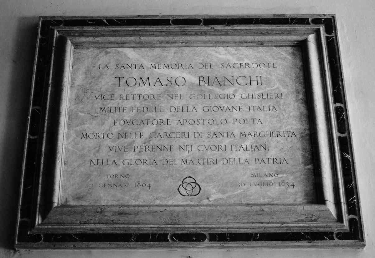 - ISCRIZIONI su tutta la superficie - la santa memoria del sacerdote Tomaso Bianchi vice rettore nel Collegio Ghislieri milite della fedele Giovane Italia educatore apostolo poeta mortonelle carceri di Santa Mrgherita vive perenne nei cuori italiani...la santa memoria del sacerdote Tomaso Bianchi vice rettore nel Collegio Ghislieri milite della fedele Giovane Italia educatore apostolo poeta mortonelle carceri di Santa Mrgherita vive perenne nei cuori italiani.. - lettere capitali -