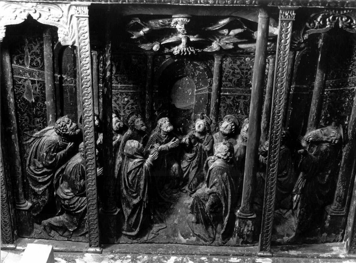 - NOTIZIE STORICO CRITICHE L'esecuzione dell'opera è documentata in modo preciso da una serie di note di pagamento conservate nell'archivio della chiesa, da cui risulta che lo scultore Giovanni Angelo Del Maino stipulò, il 18 agosto 1516 un contratto con la Compagnia dei Battuti e ricevette poi pagamenti per il suo lavoro fino al 1519. Dal 1520 al 1526 risultano invece effettuate altre spese a favore di Gaudenzio Ferrari e di Fermo Stella per la doratura e la dipintura dell'opera. L'effetto prospettico della scena è singolare e insieme rigorosissimo: poichè l'edificio a pianta centrale è perfettamente simmetrico i due pilastrini in primo piano sono in realtà le colonne della quarta parete che appare tolta a mo' di velario teatrale. Ricompare il tema ricorrente della struttura con il tiburio ottagono ispirato alla stessa forma dell'ancona e della chiesa. Le figure degli apostoli riprendono quelle presenti sulla cupola