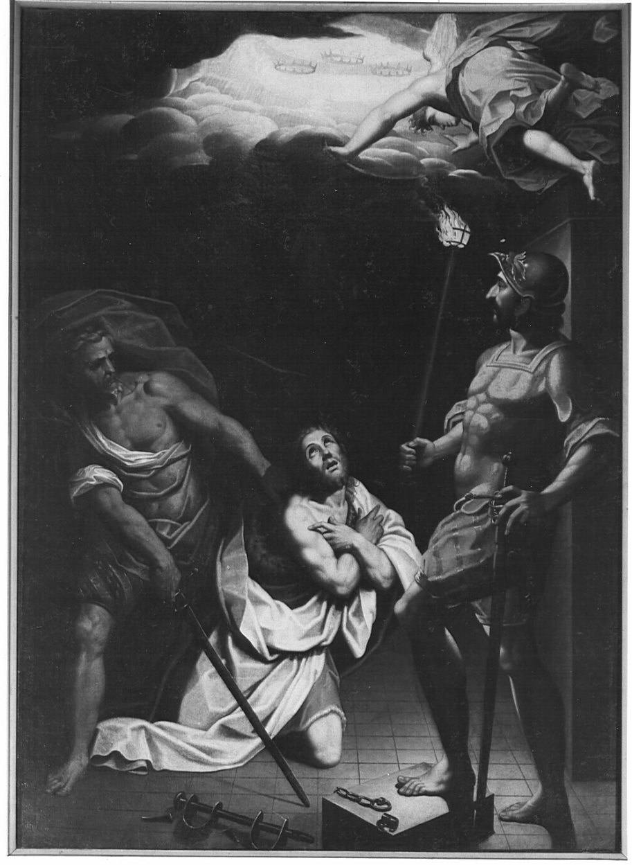 - NOTIZIE STORICO CRITICHE Il quadro pervenne a Brera dalla soppressa chiesa dei Cappuccini di Monza il 12 aprile 1808; fu concesso in deposito a S. Simpliciano il 6 giugno 1808 (Inv. Nap. 10 ). All'atto d'ingresso in Pinacoteca il dipinto era già attribuito al Malosso; il Baroni (1946) lo ritiene una replica della più complessa redazione dello stesso tema, presente nel Museo di Cremona. La Ottino (1969) pensa si tratti di una variante del quadro di Cremona, datato 1590, segna, secondo il Baroni, un fase avanzata verso l'illusionismo di Antonio Campi, verso il superamento del "pretenzioso idealismo manieristico". Un contatto con A. Campi è evidente, anche se l'invenzione dell'angelo correggesco è un'anticipazione di certi brani di Camillo Procaccini