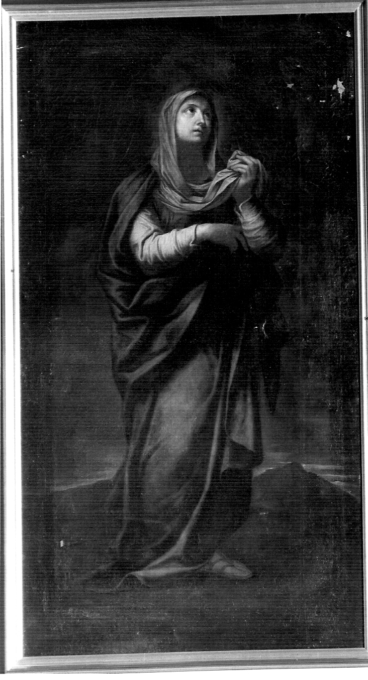 - NOTIZIE STORICO CRITICHE Lo stato di conservazione del dipinto rende parzialmente illeggibile l'iscrizione posta in basso a sinistra ma le lettere rimaste riconducono al nome dipinto sugli altri quadri; Carlo Gerolamo Castelli. l'iconografia della figura fa ritenere trattarsi non di una santa bensì della Madonna Addolorata. Questo dipinto sembra fare pendant con l'altro della serie raffigurante S. Giovanni Evangelista: la posizione delle figure consente di ipotizzare che fossero in origine collocati ai lati di una terza tela, o forse di una scultura, raffigurante Cristo crocifisso