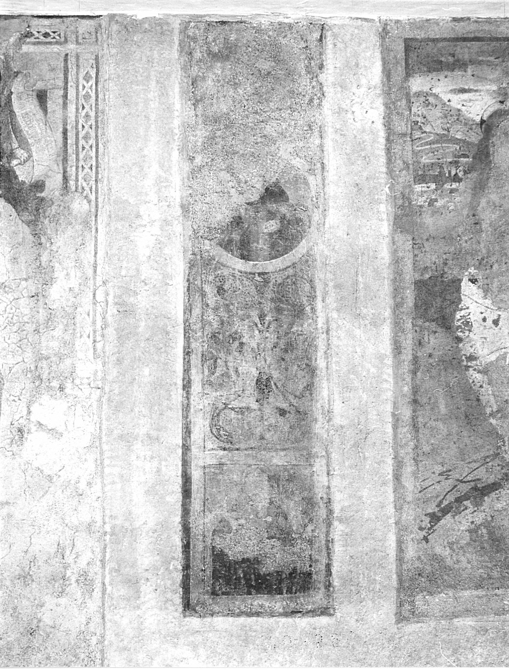 Affresco strappato con un medaglione centrale, con santo dal manto rosso cupo la veste grigia e forse una campanella d'oro (Sant'Antonio Abate), un quadrato nella zona inferiore con un santo dal manto rosso cupo ed il medesimo fregio floreale a girali su fondo giallo della predella