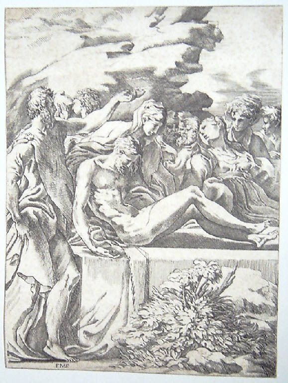 Personaggi: Cristo morto; Madonna; Nicodemo. Figure: figure femminili; figure maschili. Sculture: sepolcro. Paesaggio. Piante