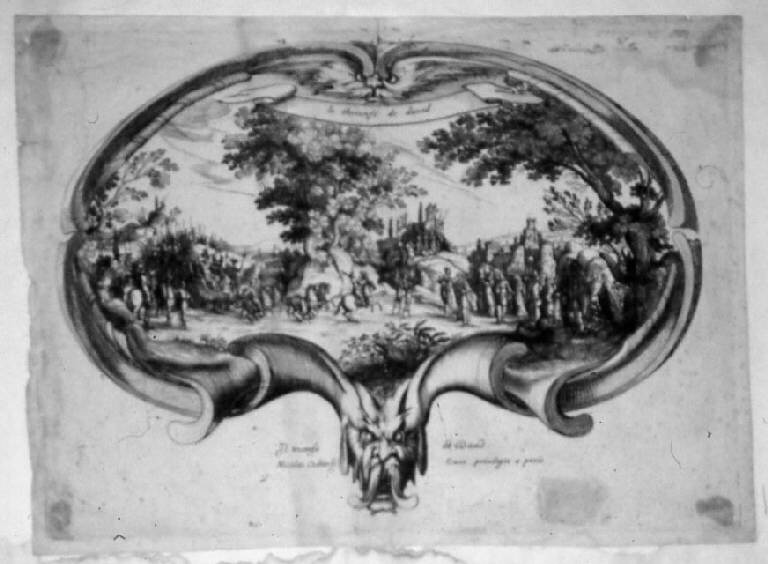 Personaggi: Davide. Figure: figure maschili; figure femminili. Animali: cavalli. Paesaggio. Strumenti musicali. Piante