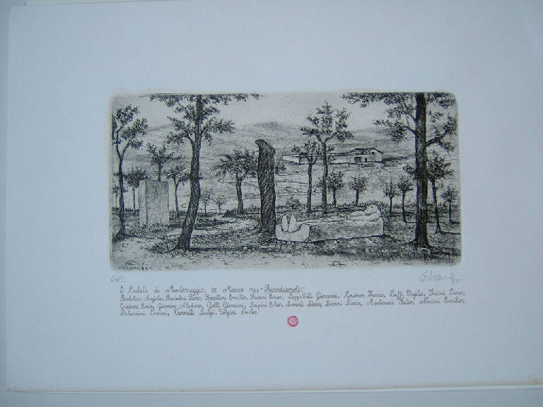 - NOTIZIE STORICO CRITICHE La stampa fa parte di una serie di incisioni, commissionate a Mauro Corbani nel 1984 in occasione del 40° anniversario di un episodio della Resistenza, l'Eccidio di Montemaggio. Tale serie è stata voluta dai comuni di Certaldo, S. Giminiano, Colle Val d'Elsa, Poggibonsi, Monteriggioni, Barberino Val d'Elsa. La Fondazione possiede un altro esemplare dell'intera serie (cfr. nn. inv. I02177, I02178, I02179). Sulla cartella è presente una dedica a matita dell'autore, poco leggibile