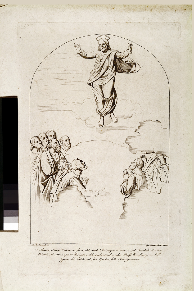 - NOTIZIE STORICO CRITICHE L'incisione in oggetto raffigura la Trasfigurazione di Cristo. Piuttosto interessante risulta la didascalia a commento dell'incisione, poichè fornisce l'indicazione che questa immagine, affrescata nel cimitero di San Miniato al Monte, fu utilizzata da Raffaello come prototipo della sua Trasfigurazione, la sua ultima opera dipinta