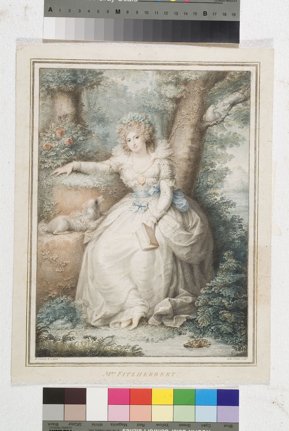 Ritratti: ritratto della signora Fitzherbert. Abbigliamento: abito bianco con ampio colletto di pizzo; maniche aderenti; nastro azzurro in vita; cammeo centrale