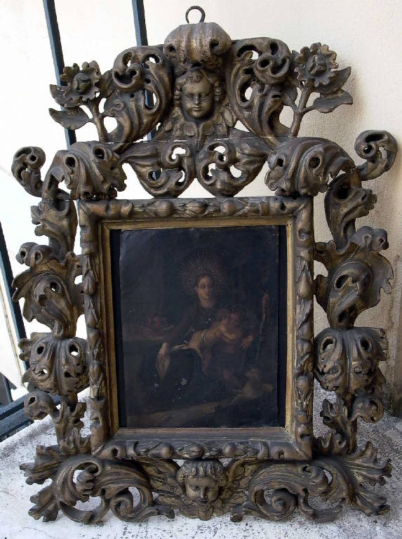 - NOTIZIE STORICO CRITICHE Il piccolo dipinto, entrato nel patrimonio della Pinacoteca Repossi nel 1926, grazie al lascito di Marianna Rota, mostra caratteri stilistici prossimi alla cultura centro italiana; con ogni probabilità si tratta di un centone da opere di artisti di primo Cinquecento, realizzato con fini devozionali, sebbene la qualità pittorica mostri la mano di un artista capace di talune finezze, soprattutto nel morbido sfumato delle carni e nella costruzione dell'ambientazione. A un ambito di più ingenua produzione richiama, invece, l'insistenza sulla decorazione dell'aureola della Vergine che riprende taluni decori di carattere popolare ben attestati proprio in ambito centro italiano. Al contrario la sontuosa cornice intagliata che lo accoglie ora, sebbene deturpata da una disastrosa ridipintura a porporina, è opera di buon pregio e, insieme a quella del dipinto raffigurante il Cristo coronato di spine (inv. n. D00012), doveva far parte di un gruppo di tre cornici per carteglorie della cui provenienza nulla si conosce di preciso. L'ambito culturale in cui collocare quest'opera d'intaglio, per l'insistenza sul trattamento carnoso eppure nervoso dei girali a fogliacce e per quel certo rigore classicista che la governa, potrebbe far pensare che si tratti di un lavoro di Orazio Olmi, figlio di Lorenzo documentato per diversi lavori anche a Chiari e autore della grande soasa lignea dell'altare della Santa Croce nella parrocchiale di Travagliato, opera che mostra di aver subito, come questa cornice, il fascino dell'ultima maniera di Giacomo Faustini riassorbendola però entro schemi di più pacato rigore e simmetria
