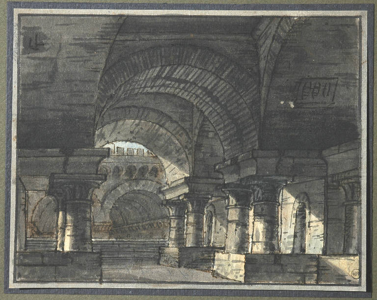 - NOTIZIE STORICO CRITICHE Il disegno non appare riconducibile a nessun autore noto. Potrebbe trattarsi di una scenografia realizzata per il Teatro alla Scala nella prima metà dell'800. Per alcuni aspetti, quali la commistione tra stili diversi nella definizione delle architetture, è forse accostabile alle opere di Alessandro Sanquirico (1877-1849)