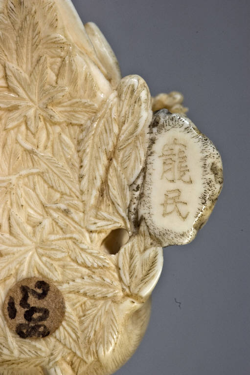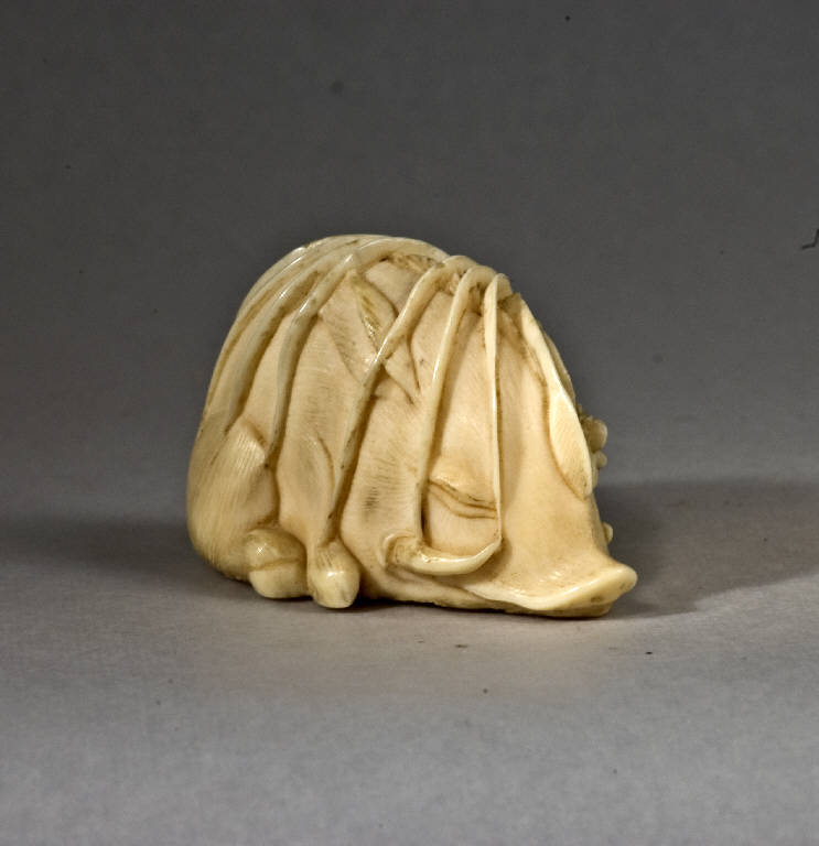 Okimono raffigurante un cinghiale (inoshishi) placidamente addormentato tra le erbe autunnali