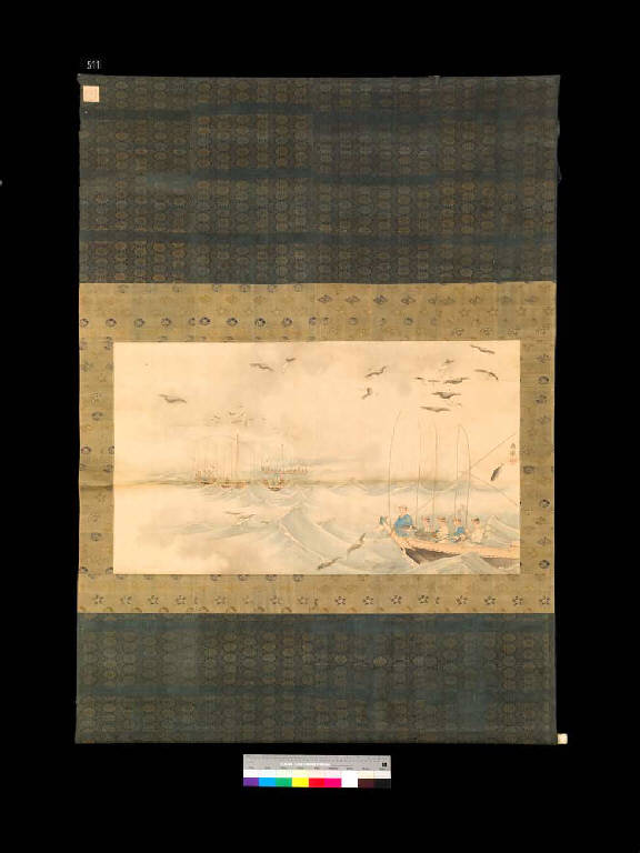 Il dipinto, nel formato del rotolo verticale da appendere (kakemono), è stato dipinto a inchiostro e colori tenui su carta. Raffigura una scena di pesca in mare aperto, con una serie di barche con pescatori, una delle quali si vede spuntare in primo piano in basso a destra. Il cielo, appena sopra le teste degli uomini, è solcato da un folto gruppo di gabbiani. Ha cornice tradizionale in seta decorata con motivi floreali stilizzati, e bacchette in legno