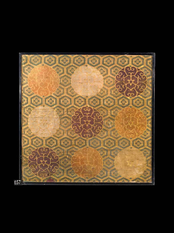 Tessuto operato con trame supplementari in oro cartaceo. Fondo oro cartaceo con disegno verde di rete con maglie esagonali a "guscio di tartaruga" (detto anche kikko isunagi) racchiudenti karahana (fiore classico cinese) verdi. Sopra la rete sono disposti su file orizzontali e parallele, crisantemi stilizzati policromi (arancione, giallo, bianco, viola, blu). Montato su cornice in vetro