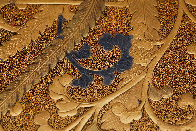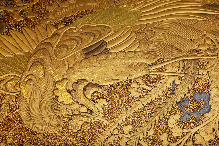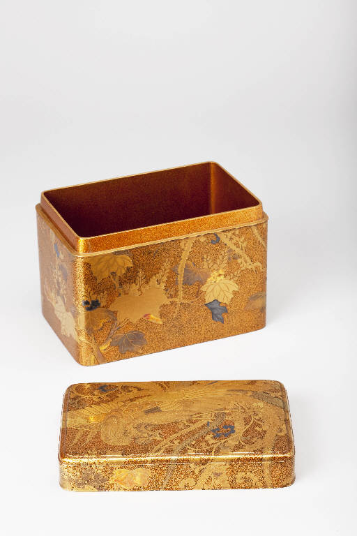 Scatola da toletta (tebako) in legno intagliato, decorato su fondo nashiji ("a buccia di pera") in maki-e ("pittura a oro cosparsa"), nelle varianti dell'hiramaki-e ("pittura cosparsa piatta") e del takamaki-e ("pittura cosparsa in rilievo"), con aggiunte di "oro ritagliato" (kirikane). L'ornato si costituisce di una fenice (hoo) tra foglie di paulonia (kiri)