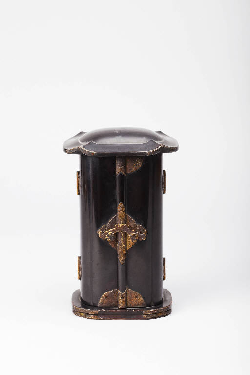 Tempietto portatile (zushi) a forma di parallelepipedo con angoli arrotondati, sormontato da tetto a cupola ribassata con i lati sporgenti. In legno laccato, di nero omogeneo sull'esterno e di oro all'interno, è dotato di serrature e finimenti in rame dorato ornato con motivi floreali a incisione. All'interno è sistemata una piccola scultura raffigurante Bishamonten che calpesta un demone, posata su un'alta base a più livelli sovrapposti. Il piano più in alto, ove posa la scultura, è arricchito da una balaustra con il bordo superiore intagliato a ogive che ricordano nuvole, dipinto sull'esterno a inchiostro nero con arabeschi che ricordano anch'essi nuvole