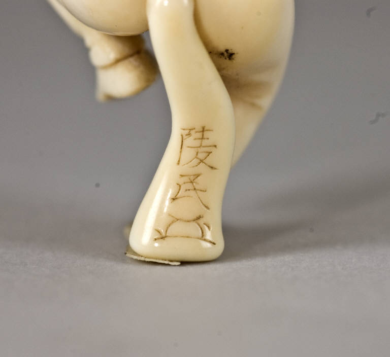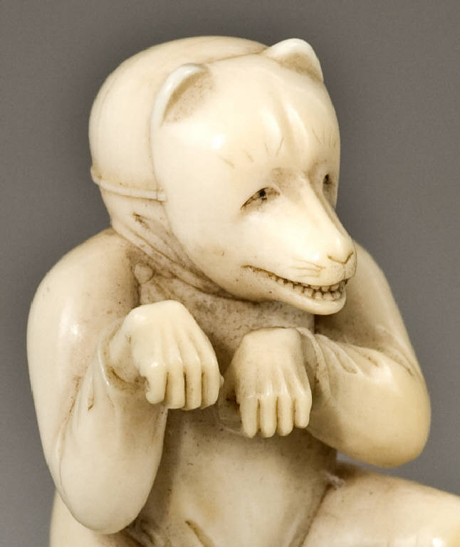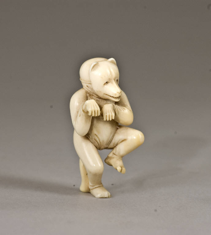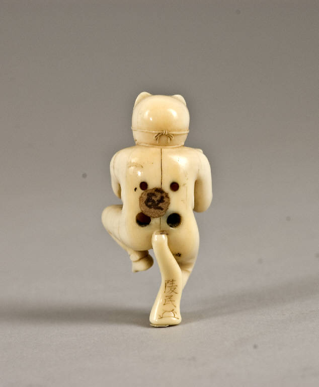 Netsuke raffigurante un uomo intento ad eseguire la danza della volpe, vestito di un costume privo di decorazioni ma con la coda sul retro e con il viso coperto da una maschera. I due fori dell'himotoshi si trovano sul retro, in prossimità del bacino, disposti uno di fianco all'altro in orizzontale