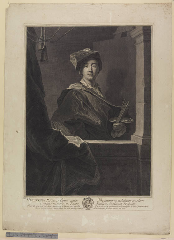 - ISCRIZIONI nel margine inferiore - HYACINTHUS RIGAUD Eques natus Perpiniani ex nobilium ejusdem/ civitatis numero. in Regia Picturae Academia Professor./ hanc ab ipso met coloribus effigiem, aeri incidit Petrus Drevet Lugdunensis Calcographus Regius; perenne grati/ animi monumentum; quod illum in artis peritia sapien- -tibus consiliis juvenit anno. M. DCC - a incisione -