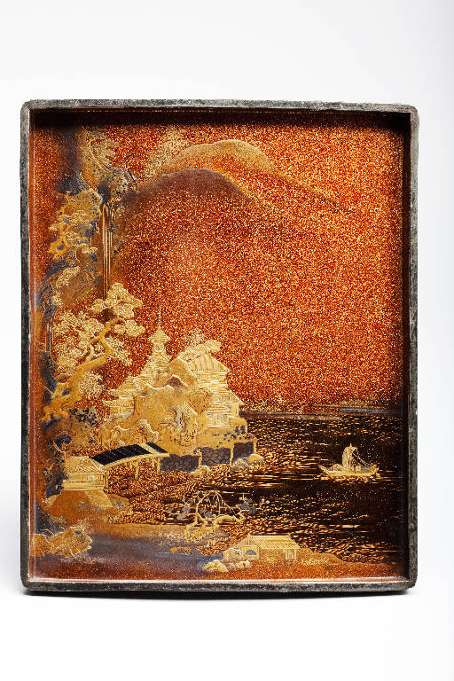 Scatola per calligrafia (suzuribako) in legno, rinforzata sui bordi da un supporto in bronzo. Coperchio scolpito con volatili. Interno laccato a rilievo (takamaki-e) su fondo a buccia di pera (nashiji) in oro e argento con decorazione di lago, battello, pagode e alberi. Include vaschetta, tavoletta per inchiostro e contenitore dell'acqua per sciogliere l'inchiostro (suiteki) in argento lavorato a incisione a forma di convolvolo (asagao)
