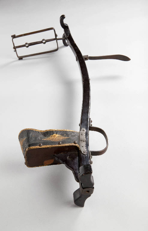 Stativo portaarco di tipo yumidai in legno laccato di nero, con accessori in pelle dorata e metallo