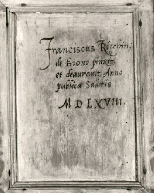 - ISCRIZIONI in alto al centro - Franciscus Ricchin, / de Biono pinxit / et deauravit, Anno / publicae salutis / MDLXVIII." -