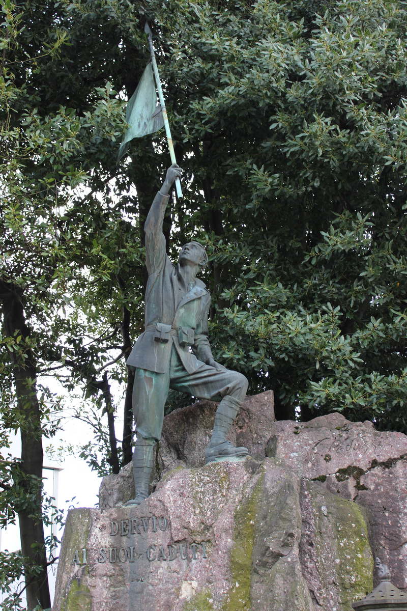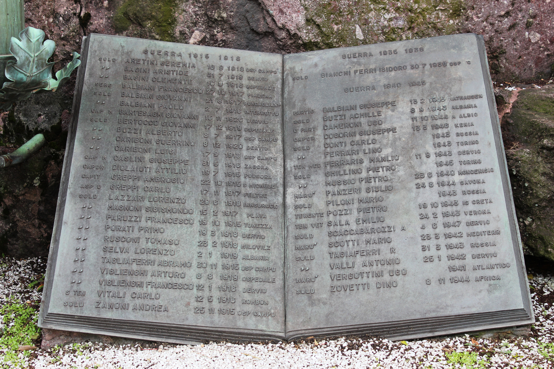 monumento ai caduti della prima e della seconda guerra mondiale, a montagna figurata sormontata da una statua in bronzo di un soldato che porta la bandiera. La montagna è realizzata in pietra rossa della Valcamonica. In basso è collocata una targa a forggia di libro su cui sono riportati i nomi dei caduti
