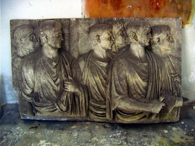 - NOTIZIE STORICO CRITICHE Il calco è tratto da un fregio di età augustea (sec. I a.C.) conservato nel Museo Gregoriano Profano (già nel Museo Lateranense). Il rilievo raffigura una processione imperiale. La testa dell'imperatore era mancante e fu restaurata da Bertel Thorvaldsen con il ritratto di Traiano (secc. I-II d.C.) creando una incongruenza con la datazione del rilievo. Allo stato attuale degli studi non è possibile determinare la data d’ingresso del gesso nel patrimonio dell’Accademia né dove e quando sia stato formato, per questo vengono indicati come estremi cronologici il 1797 e il 1963. La prima data fa riferimento all'arrivo di Thorvaldsen a Roma, infatti nel calco è presente la sua integrazione del reperto originale. La seconda data fa, invece, riferimento all’ultima acquisizione di calchi da parte dell’Accademia Carrara. Il gesso è stato preso in considerazione da Lucrezia Bertoli nella sua tesi di laurea, travisandone il soggetto