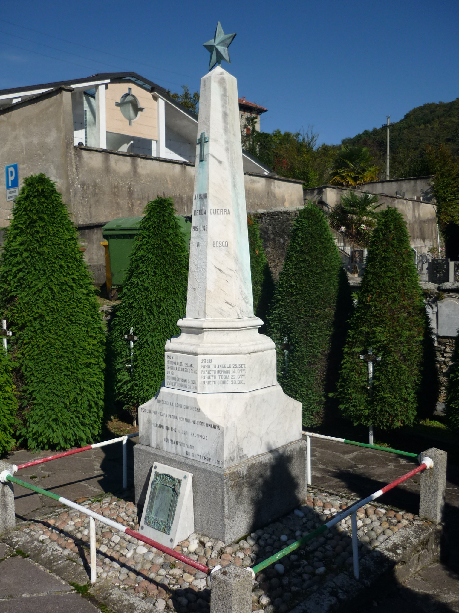 - ISCRIZIONI lato anteriore - AI SUOI/ MORTI NELLA GUERRA/ 1915-1918/ IL POPOLO DI BOSCO 1915/ BRICCOLI ANGELO 9.SET./ PARIETTI GIOVANNI 16.OTT./ PARIETTI AMATO 22.OTT./ 1916/ MORONI BARTOLOMEO 17.LUG./ 1917/ MORONI LUIGI 29.AG./ DE-NICOLA FRANCESCO 31.AG./ 1918/ MORONI GIOVANNI 5.GEN./ PARIETTI ISIDORO 31.GEN./ 1918/ PARIETTI ANGELO 25.SET./ PARIETTI ROMANO 14.OTT./ PARIETTI TOBIA 22.OTT./ PARIETTI DIONIGI 20.DIC. DIEDERO LA LORO GIOVINEZZA/ PER UNA PIU’ SICURA PATRIA PER UNA MIGLIORE UMANITA’/ FACCIAMO NOI CHE IL LORO SACRIFICIO/ NON SIA STATO VANO/ 20 SETTEMBRE 1919 - capitale - a rilievo -
